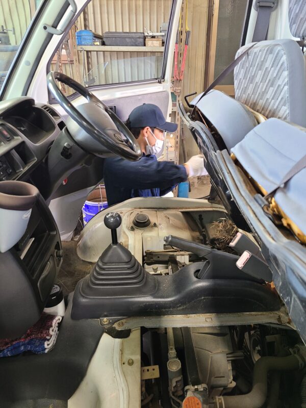 エンジンルームを開けてみると・・・ なんと鳥の巣を発見!運転席側の奥に枯れ草で出来た巣がありました。