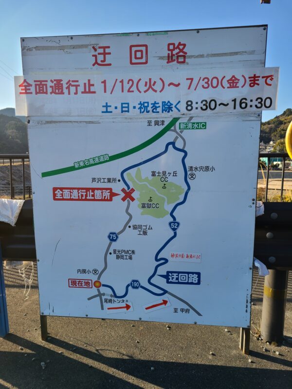 この道は国道52号線で清水方面に向かう近道ですが、平日の昼間 清水方面へ向かう方 清水から富士宮方面に行かれる方は迂回のため時間に余裕をもってお出かけ下さいね。